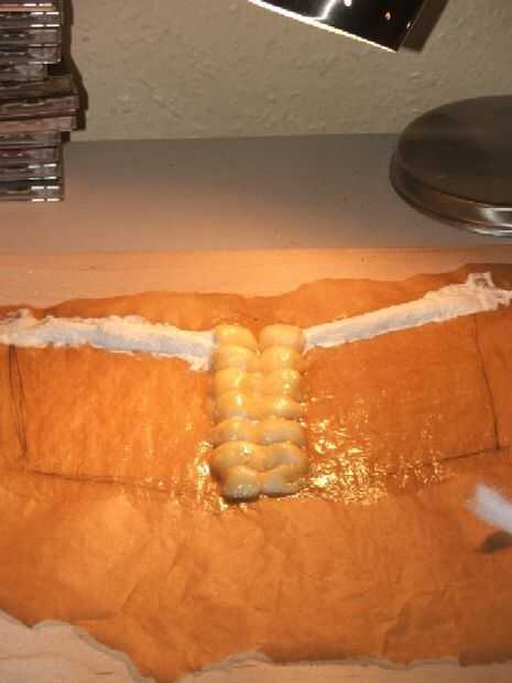 Cinta del papel encerado abajo en su banco, dibujar la forma básica de la caja torácica, luego pintar en tres finas capas de látex líquido, permitiendo que cada una se seque entre. Las capas son suficientemente secas para trabajar una vez que pasan de líquido blanco de goma transparente.