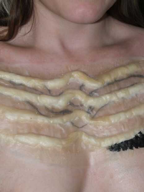 Aquí es Tara con un inacabado prótesis pegada a su pecho. la marca negra es una prueba de pintado de la zona.