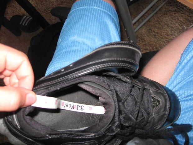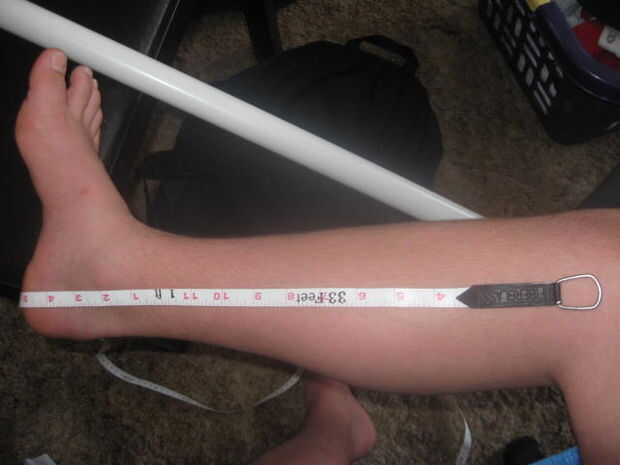 Donde estaba la línea de corte en el pie dibujar o colocar una línea de cinta en la otra pierna y medir allí desde esa línea a 1½ pulgadas sobre el talón (necesita dejar espacio para el codo común). (Por ejemplo, si había perdido mi pierna derecha que tomaba la línea de los cirujanos cortan en y dibujan en mi pierna izquierda y medida en mi pierna izquierda.) Esta es una de las mediciones de la PVC. A continuación, tome el zapato elegido y medida desde el talón de la zapatilla en el lugar donde el techo de los zapatos es sólo un poquito más 1". Usted tenga que recortar esta pieza un poquito.