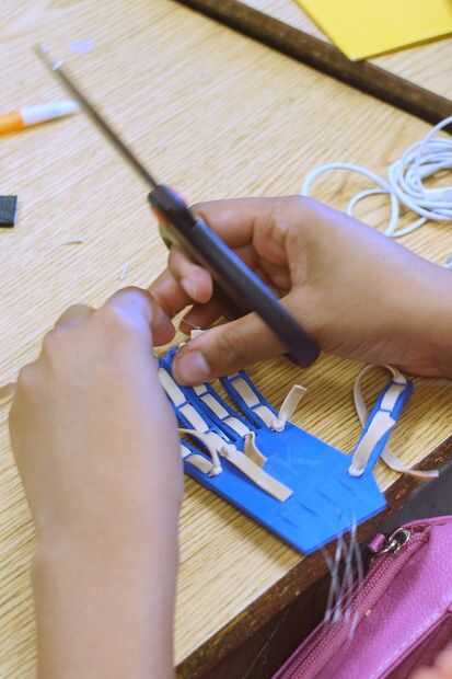 Ahora usted puede hacer los ajustes finales para el tensado de la banda de goma. Si alguno de los dedos no volver sin problemas, aumente la tensión de los dedos por empujar el nudo de goma más cerca al dedo con la banda de goma estirada un poco. No te preocupes si se rompe una banda de goma, usted puede substituir fácilmente.
