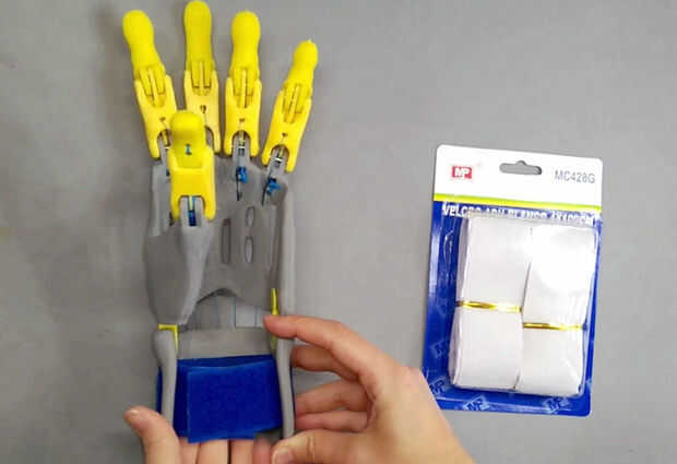 Utiliza Velcro para sujetar la mano a la muñeca. Velcro con adesivo es muy cómodo para él.