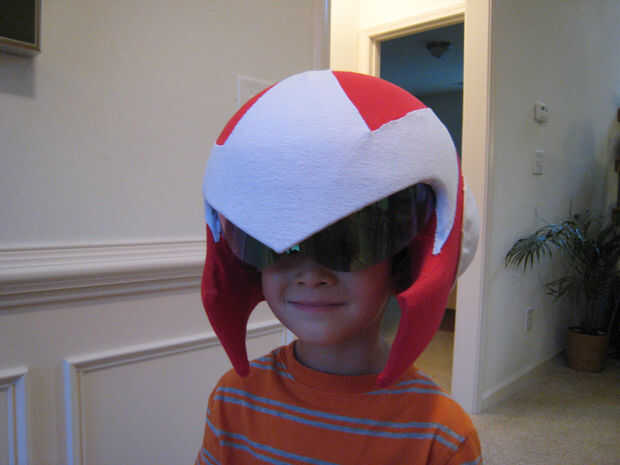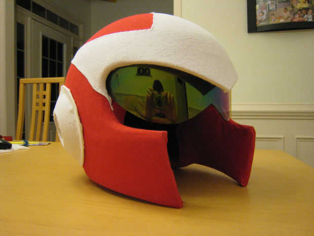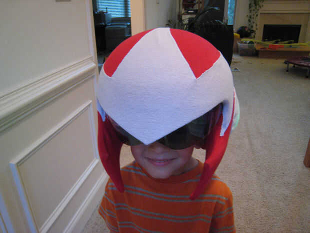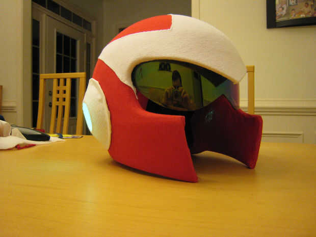 Hice una plantilla para la parte blanca del casco, cubre el pico de las viudas con tres formas de triángulo tiro encima de él. Corté una pieza blanca de la tela, dejando un montón de extra en la parte inferior donde se envuelva alrededor del pico de las viudas. Tener esta pieza blanca realmente ayudó. Tenía un rebaño en la roja que no podía conseguir paseo de, pero se esconde detrás del blanco. También, mirando hacia atrás ahora, yo podría han sido capaces de acabar con la costura en la espalda, como podría haber tirado a la tela en la parte frontal y tenía la tela blanca cubrirlo.
