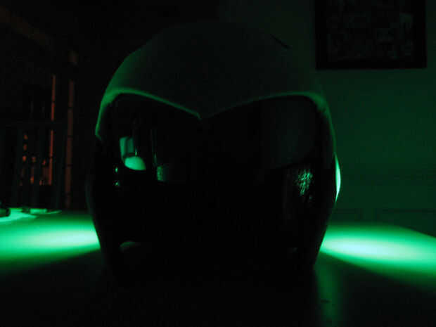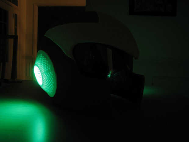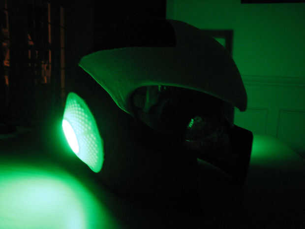 Mi esposa luego cosidas todas las piezas sueltas de material en el interior del casco donde podía. El pico de las viudas que se pega en su lugar debido a la visera que fue apropiado entre el casco y el poliestireno.