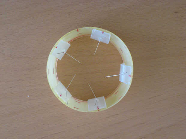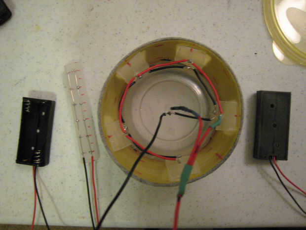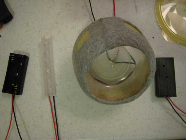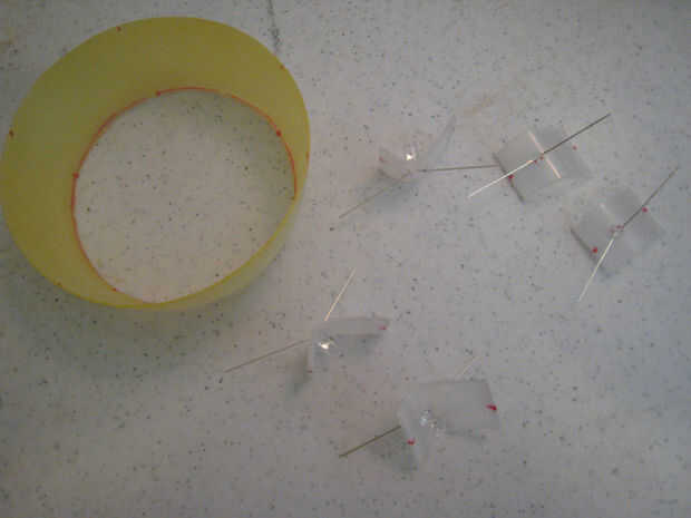 Por el dato, me di cuenta de que todos modos tuve que montar los LEDs. Lo que hice fue cortar el borde inferior de un envase plástico cuadrado en pedazos pequeños en "L". De esta manera estarían fuera del camino de los titulares de la viga principal. Tengo perforados los agujeros pequeños en la curva de la "L" en forma de piezas e instalado los LEDs. Uso de las marcas que hice, alineados cada "L" en forma de soporte de LED y ajustaron en su lugar, uno a la vez.