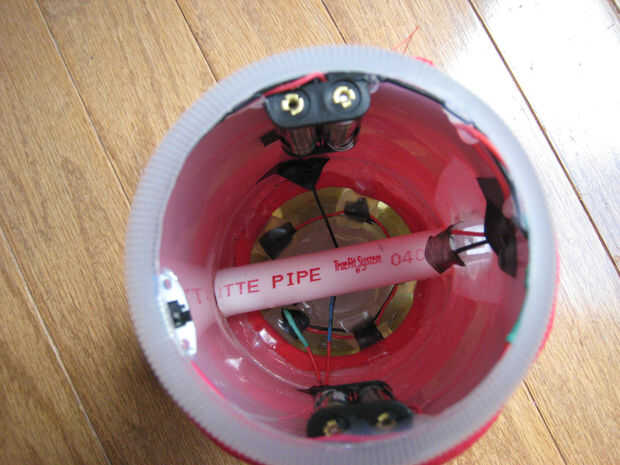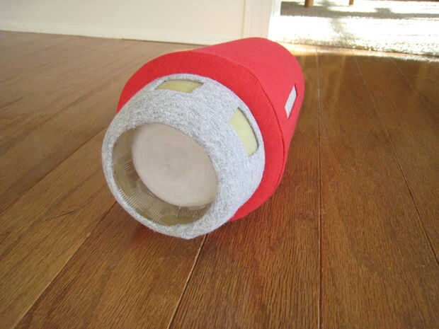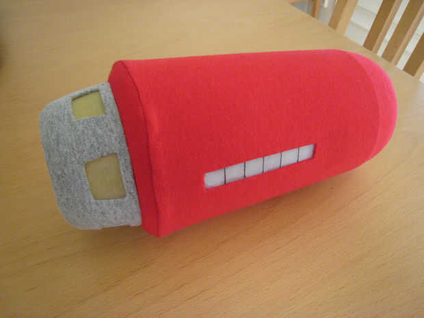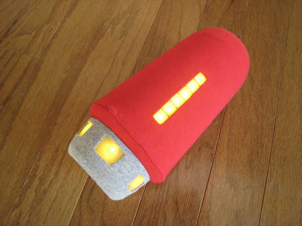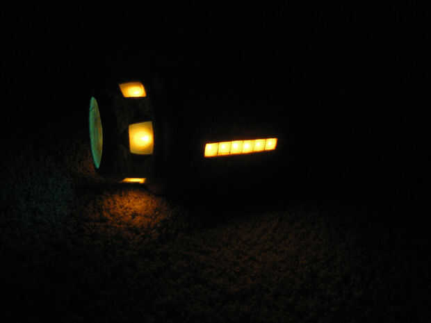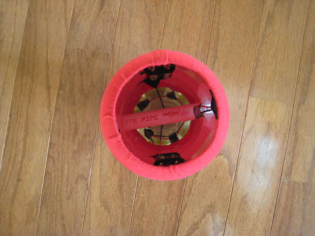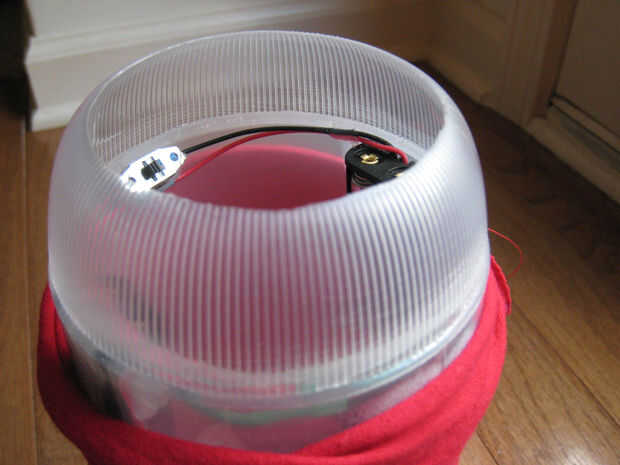 Encamine los alambres en el interior de la Proto Buster. Usé cinta adhesiva negra para mantener todo en su lugar mientras que ajustaron hacia abajo. Debo haber ya sea pintado o poner más cinta negra alrededor de la barra de luces en el cuerpo principal cortar luz interna. Ajustaron la última pieza, el recipiente inferior, en el cuerpo principal. Luego mano había cosida a la piel hasta el contenedor inferior y caliente lo pegan en su lugar en el interior.