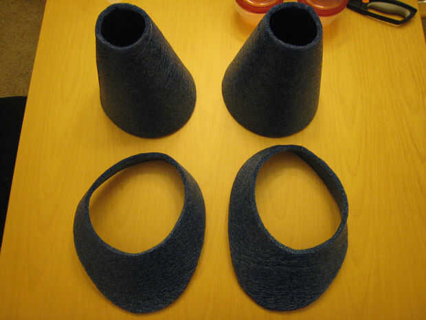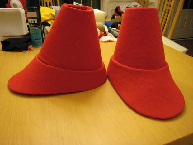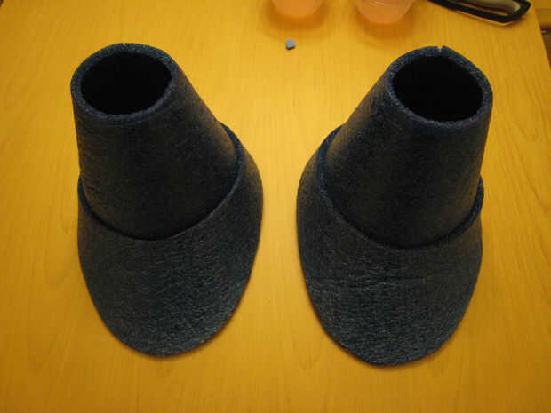 Luego caliente pegué las dos piezas juntas, junto con una correa elástica. La correa elástica sirve dos propósitos; primero tiene la bota en forma ovalada en lugar de una circular, entonces también tiene la bota hacia abajo en la pierna la correa irá por debajo de la zapata. En cuanto a cómo unir las dos piezas, incline el cono hacia atrás un poco la rodilla para el arranque es sobre la parte posterior del pie. Esto permite dos cosas el pie puede sentarse más lejos, y hay espacio para la parte delantera de la zapatilla para caber debajo de la parte frontal del cono.
