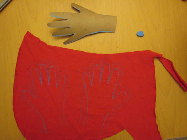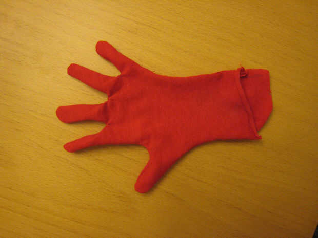 Para el guante he hecho una plantilla trazando mi mano de hijos. Este recorte y poner en tela de. hizo dos líneas alrededor de la plantilla. Una línea para coser, la otra para el corte. Volteado de la plantilla y marcó una segunda pieza. Cortar y coser los dos pedazos juntos. Gire derecha hacia fuera y esto se hace.