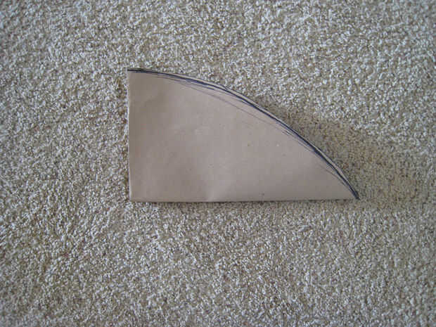 Después de conseguir todos los materiales que necesitaba, hice una plantilla de un rollo de papel marrón que tengo. Tomé un pedazo grande de papel y dobla dos veces. Una vez a lo largo de la longitud vertical y la segunda a lo largo de la longitud horizontal (como hacer un copo de nieve de papel). Dibujé una línea que sería hacer 1/4 de la pantalla, luego se corta. Lo revelado y tenía una plantilla completa para el escudo.