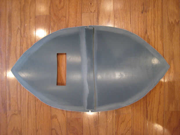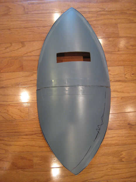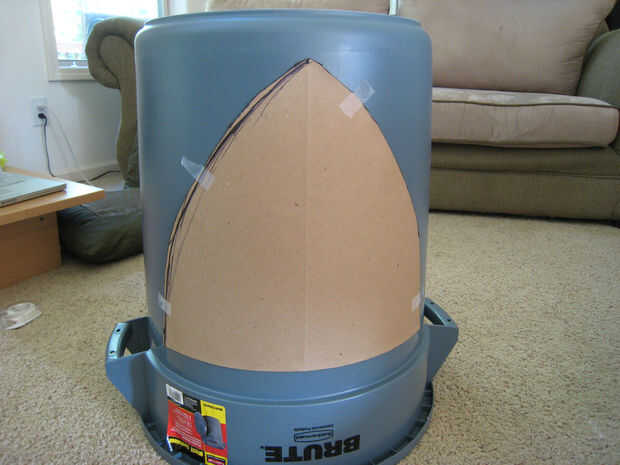 Luego pongo la plantilla en el tacho de basura. Ya que yo quería el escudo a ser cóncavo en horizontal y vertical (y puesto que la basura no era lo suficientemente alto para conseguir el escudo de una sola pieza), utilicé 1/2 de la plantilla para recortar el escudo. Lo que necesitaba saber era el borde inferior del triángulo es necesario tener una curva a la misma. Así que agrega una pulgada a la línea de fondo y hace una línea curva hasta los lados del escudo.