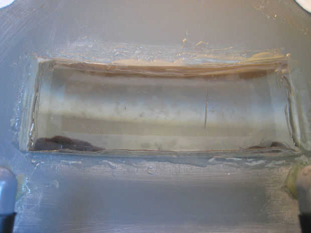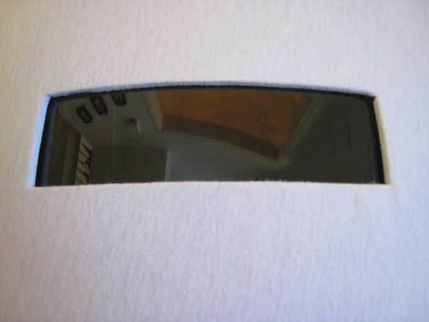Ahora con el lado de tinte de plexiglás frente a la abertura en el escudo de pegamento en su lugar con el epoxi. Asegúrese de que aplica la tinta a la superficie frente a exterior de plexiglás (si aplica en dentro de agrupar se producirá en el tinte si se aplica antes de instalar en la superficie curvada del escudo). Sujetarlo con algo pesado hasta que el pegamento se establece (o simplemente empujarlo a ti mismo).