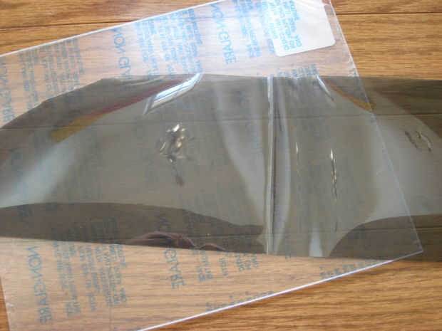 Corte el plexiglás que sobre una de 2" sobre la caída en comparación con el escudo cortado. Corte el tinte de la ventana por lo que tiene sobre 1" sobre la caída. Esto asegurará que el epoxy plástico puede enlazar directamente con el plexiglás y no el tinte.