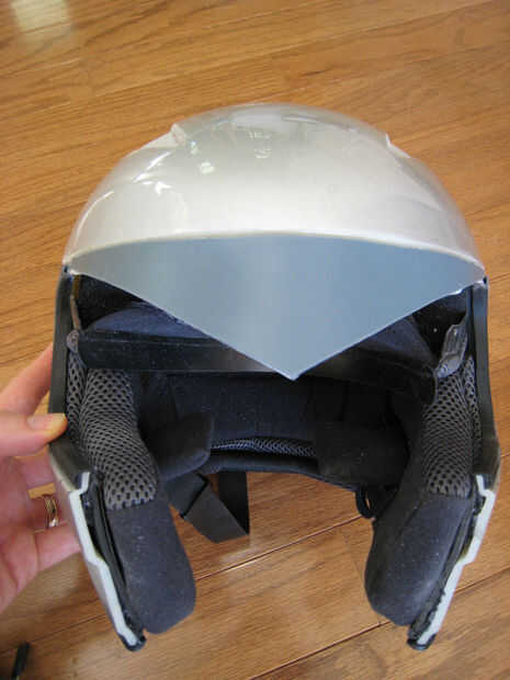 A continuación hice una plantilla con papel marrón para el pico de las viudas. Corte la lata de basura con el cuchillo. Se quitó la Junta de tiempo en la parte superior del casco, por lo que podría aplicar el pico de las viudas. Ajustaron el pico de las viudas en el casco y sujeta con unas pinzas C.