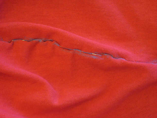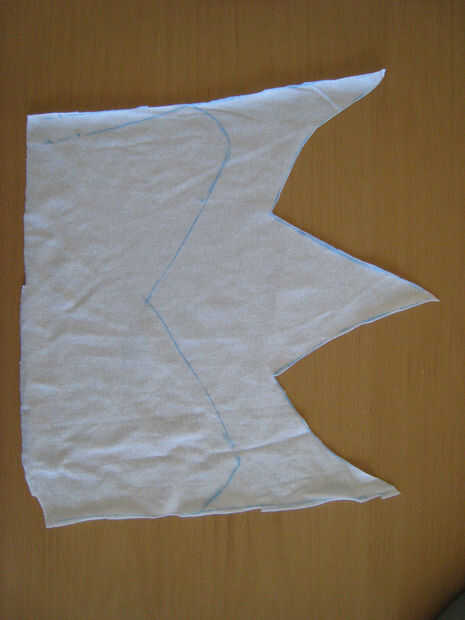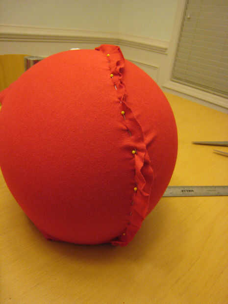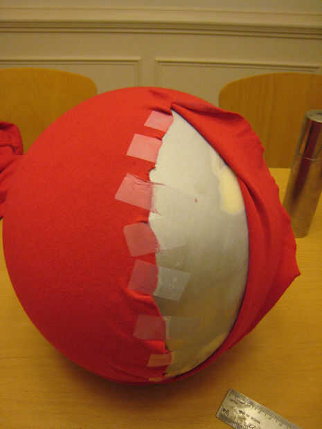Tomé la tela apagado, asegurándose de que los pernos para el pico de las viudas y las áreas de la mejilla me alojé en (éste era mi referencia). Dio vuelta adentro hacia fuera, y usando la tiza de la tela había marcada la costura antes de retirar las clavijas. Me quita los pasadores, voltea la tela en la costura de la otra manera (desde antes la tela sobrante se sobresale el casco, en vez de dentro). Seguí mi línea de tiza y cosieron la costura.