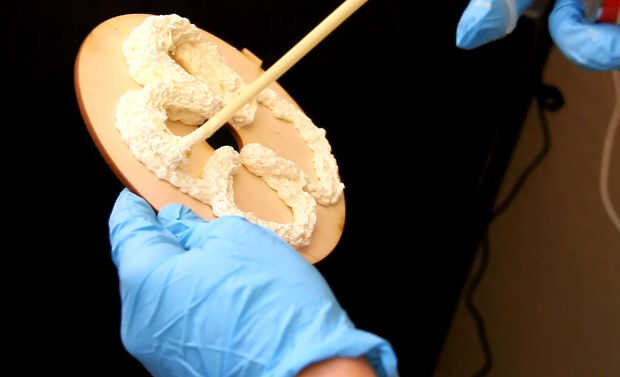 También importa la cantidad de material. Si aplicas demasiado, curará más irregularmente. Si se aplica muy poco, no habrá suficiente material para apoyar la estructura del artefacto. Tuvimos más éxito con el patrón "cuadrado con diagonal" con 3 niveles de espuma ya que era el mejor equilibrio de curado igual y apoyo material.