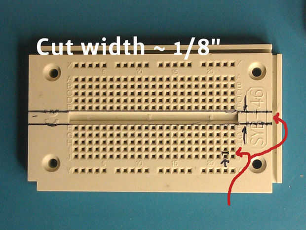Utilizando un marcador mágico, marque el protoboard como se indica en el centro de la foto.