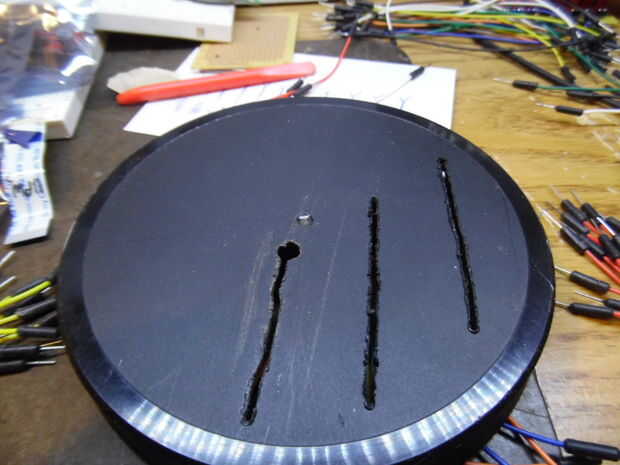 Después de cortar una tapa para arriba como una prueba, estaba contento con las 5 ranuras que deseaba había, un poco podría haber sido un poco más, pensé en les curva o incluso zig-zag les pero al final acabo de ir con las líneas rectas. Usando la primera de ellas como mi plantilla, marcados los agujeros que comenzaban en la tapa del siguiente, los agujeros perforados y utiliza ese conjunto de agujeros como una plantilla de la tapa 3. La tapa 2 tenía mejor espaciado y ubicación de los agujeros y líneas de partida.