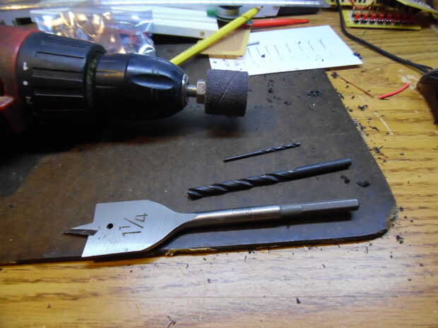 Esa hoja de 1 1/4 de pulgada no es lo suficientemente grande como para permitir que un tubo de pvc de 1 pulgada para deslizarse a través del orificio, por unos pocos milímetros. (Sí me gusta usar milímetros para las medidas pequeñas). Así que usé un poco de lijadora de tambor en el mismo taladro inalámbrico de 12V para hacer el agujero un poco más, prueba el tubo de pvc cada pocos minutos. Estaba buscando un ajuste muy muy apretado.