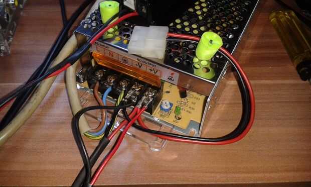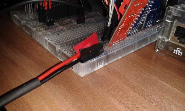 Luego, soldado 3 pines de mis cabezales de perno masculino a cada uno de los extremos preparados del cable rojo y negro, aislado como los demás y une la izquierda sobre conectores del conector molex quitado a mi agradable fornido 5V fuente de 10 amperios que no sólo alimenta un 10 puertos USB pero una frambuesa pi también.