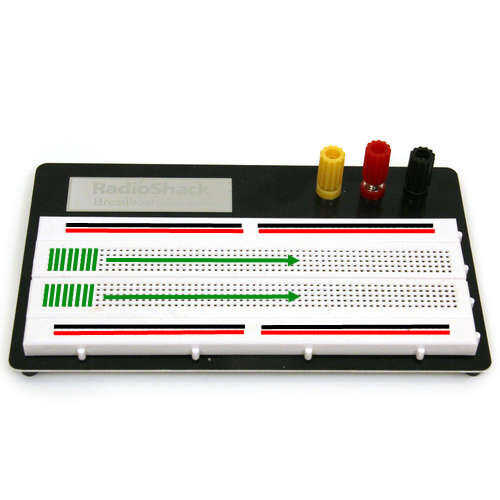 Breadboards generalmente se dividen en cuatro secciones, dos secciones externas y dos secciones interiores. Cada fila de 5 tomas en las secciones interiores están conectados eléctricamente entre sí (véase las líneas verdes en la figura 3). Las dos secciones exteriores de la placa se utilizan generalmente exclusivamente por el poder. En muchos breadboards estas tomas serán marcados con colores que denotan voltaje positivo (generalmente rojo) y tierra (negro o azul). Es importante tener en cuenta que en muchos breadboards las líneas eléctricas sólo ejecutan la mitad de la longitud de la Junta (como se indica en la figura 3). Se necesita ejecutar un cable entre estas dos secciones para enviar energía a partir de un extremo a otro. No hay nada especial acerca de las secciones exteriores de la placa que hace particularmente conveniente para la energía que pasan la mayor parte de la longitud de la tabla, pero si usted decide usar estas filas para otras cosas puede confundir otros o incluso a ti mismo, por lo que es una buena práctica para utilizar éstos para poder solamente.