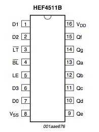 La configuración de pines de la 4511 se da en la hoja de datos, y he copiado en la figura 2. Observe cómo pin numeración comienza en 1 en la parte superior izquierda de la viruta (indicado con un semicírculo o a veces un punto) y envuelve alrededor del exterior del chip hasta el final a las 16 en la parte superior derecha.