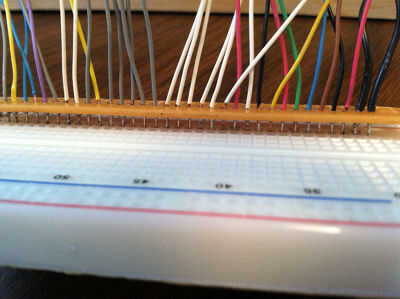 Ahora cuidadosamente Alinee los cables con los agujeros y empujarlos hacia abajo en la protoboard.  Dejé los cables suficientemente largos que pude dar un vistazo medio para confirmar que agujeros cada alambre entró.