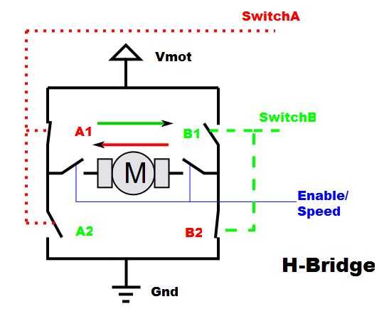 El microcontrolador suministra las señales de control SwitchA (que puede ser alto o bajo), SwitchB (HI o LO) y habilitar (HI o LO). Controles SwitchA A1 y A2 en el diagrama. Cuando SwitchA es HI, se cierra el A1 y A2 está abierto. Cuando SwitchA es LO, A1 está abierto y se cierra el A2. Controles SwitchB B1 y B2 de la misma manera. Activar funciona de manera diferente. Cuando Enable está HI, cierran de ambos interruptores conectados a la misma; que abierta cuando así se LO, apagar el motor. Consideremos lo que sucede cuando hacemos SwitchA HI, SwitchB LO y HI permiten. Cierran de los dos interruptores controlados por habilitar, y A1 y B2 también cierran. A2 y B1 permanecen abiertas. Así que es un circuito completo de Vmot (la tensión en los motores) a la tierra a través del motor. Corriente fluye tal como se muestra por la flecha roja. Si ahora apague SwitchA y encender SwitchB, A1 y B2 abren mientras cerca de A2 y B2. Otra vez tenemos un circuito completo de Vmot a tierra, pero esta vez que la dirección del flujo de la corriente se invierte a través del motor (como se muestra por la flecha verde), así que invierte su sentido de rotación.