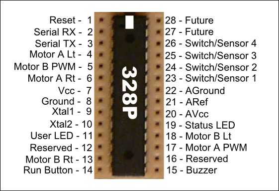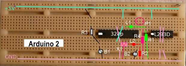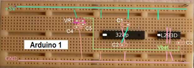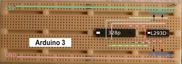 Comience por instalar el microprocesador AVR328P (también se puede utilizar el 168 versión – sobre todo funciona de la misma, apenas sin espacio para expansión). Debe ser programado con el bootloader de Arduino. También instalar el L293D puente H doble como se muestra en el diagrama con la etiqueta "Arduino 1". Este diagrama también muestra cómo conectar la alimentación y el regulador de voltaje IC. Conectar los titulares de la batería como se muestra en el diagrama de conexión del soporte de batería, pero no realmente cualquier para alimentar la placa todavía! Si utilizas portapilas con cables ya conectados a ellos, el cable rojo será positivo y el cable negro negativo (tierra). Si no estás seguro, comprobar con el voltímetro.
