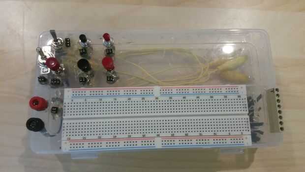 Un par de los objetivos de diseño fueron--piezas de uso que tiene en la mano, eliminar el desorden y hacer una plataforma más estable de la prueba. Es molesto tratar de utilizar botones y switches que flotan libremente conectado a mi tablero con alambres. También pensé ¿ser grande mantener mi prueba conduce con la protoboard, y noté que todos mis breadboards tenían almohadillas adhesivas en la parte inferior, así que me agarró un organizador de piezas y había pegado a la placa para la tapa de la caja, luego pensé, bueno, ¿por qué parar allí?