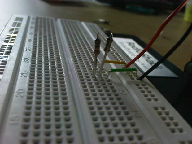 ahora a añadir las resistencias serie, simple colocar una pierna en la misma columna de la izquierda más patas de las resistencias y la otra pierna en el agujero al lado. (también en la foto)