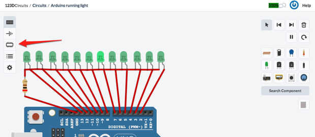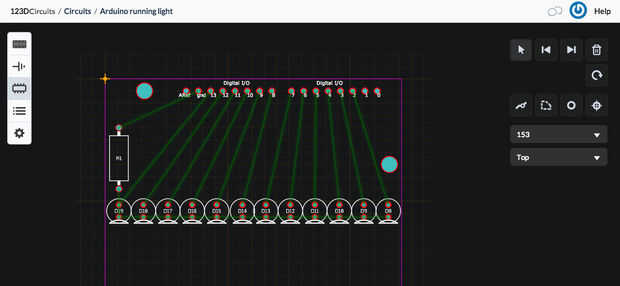 Ahora coloque los componentes en el protector de Arduino (dentro del rectángulo morado). Cambia de tamaño la pantalla arrastrando el contorno morado por lo que pude colocar los LEDs en una fila.