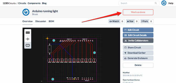 Cuando todos los rastros se enrutan volver a la visión general del proyecto y haga clic en "Marcar como hecho". Ahora el diseño se mostrará en la galería y otras personas pueden verlo. Ahora también es posible pedir a la Junta.
