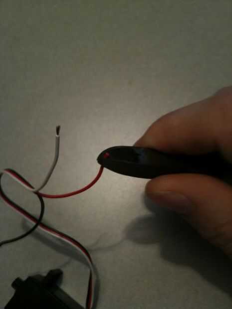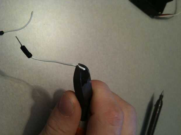 Ahora es el momento de pelar los cables. Agarra un hilo sobre 3 o 4 mm desde el extremo del alambre y entonces la luz abrazadera abajo en el aislamiento del cable. Entonces tire el aislante de los cables. Hacer esto a todos tus extremos desnudos.