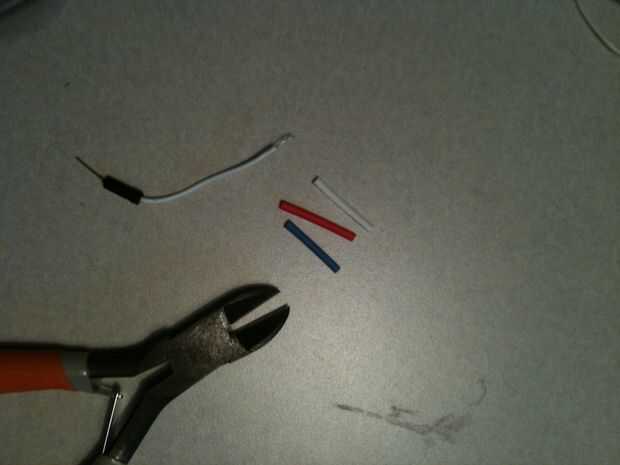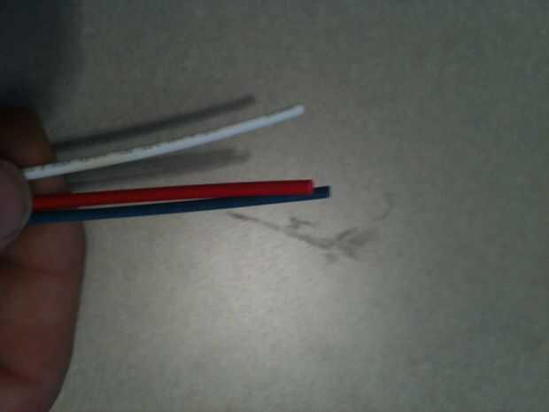 Corte tres piezas de termoencogibles aproximadamente 1/2 a 3/4 de pulgada de largo. Se deslizan uno sobre cada alambre, cuando hemos terminado para soldar los cables, el termo retráctil se deslice sobre la articulación y tápelo.