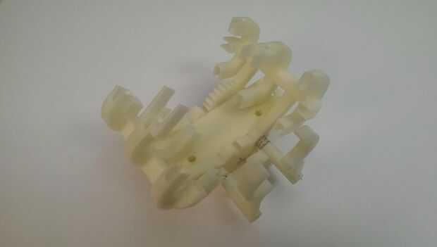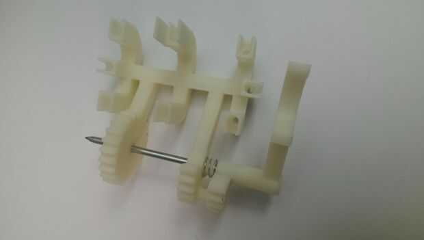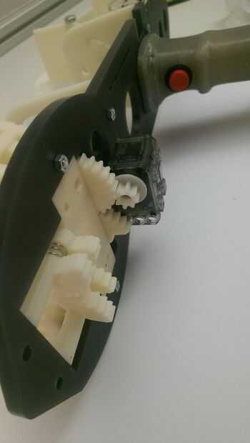 1. Ensamble las piezas cutting_cuff_holder, cutting_cuff_left y derecha utilizando dos 64 mm Ø3 mm árbol largo. Aline de los dientes del engranaje que los puños se cumplen exactamente en el centro.