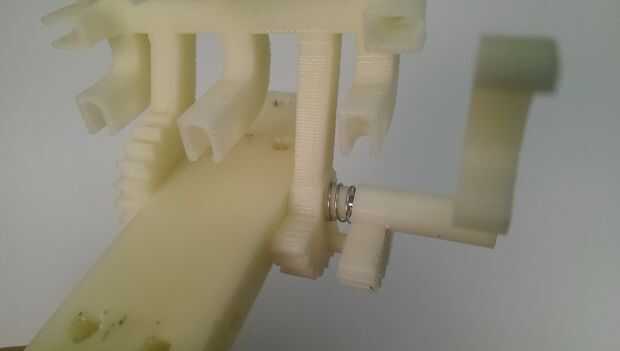 2. la parte tube_stabilizer en el lado izquierdo debe ser montado con un muelle, que empuja el estabilizador clapmp hacia adentro. Esta parte debe agarrar y centro del tubo, antes de los alambres de corte comiencen a cortar. Encontrar un trocito de primavera y cortar y doblar como en la foto. Perfore pequeños agujeros en las piezas en las posiciones de derecha para el resorte empujar la parte hacia adentro. La fuerza de giro debe ser algo suave.