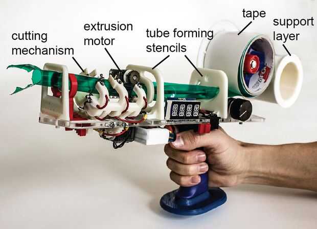 El dispositivo crea tubos como una simple cadena de montaje: tira de la cinta del rodillo, formas en un tubo, sella el tubo, "marcas" de los conectores de la mariposa en el tubo y finalmente se corta el tubo acabado.