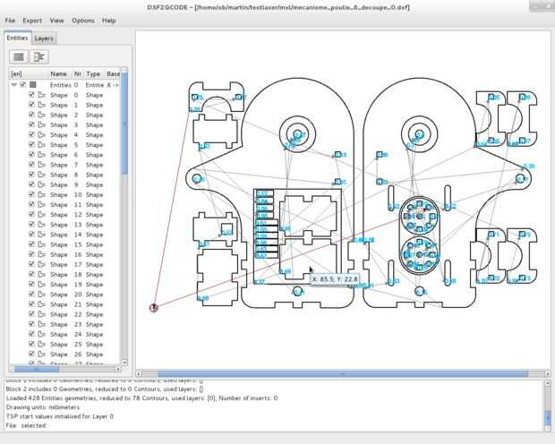 Sólo inserté una exportación a dxf archivo tras el paso de optimización, usando lo scripts dxfImport de Christian Kohloeffel (GNU Public License). En este maneer, llego test4.dxf archivo generado con las líneas de dxf bien ordenadas.