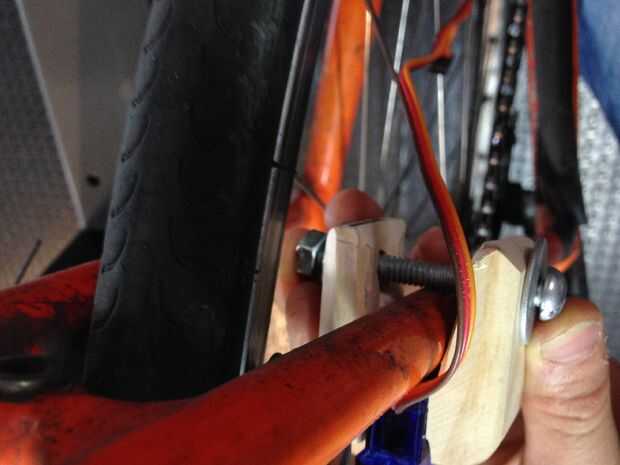 Luego tomamos el tornillo y la tuerca y ajustar el servo motor mout a uno de los tubos de la horquilla trasera.
