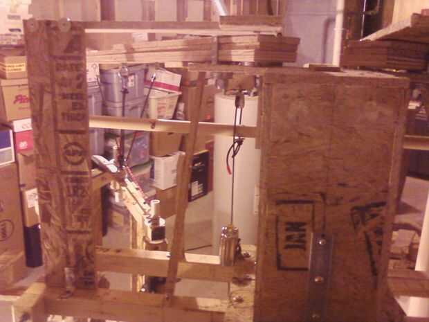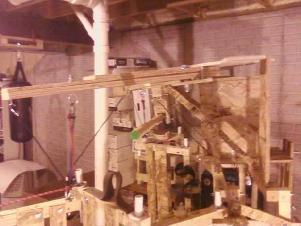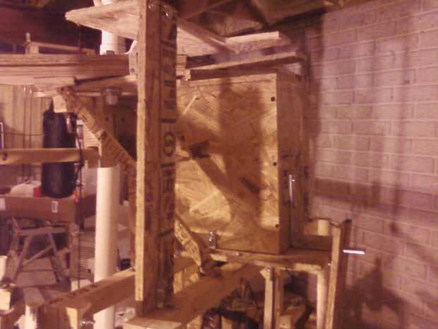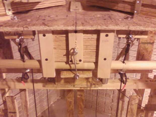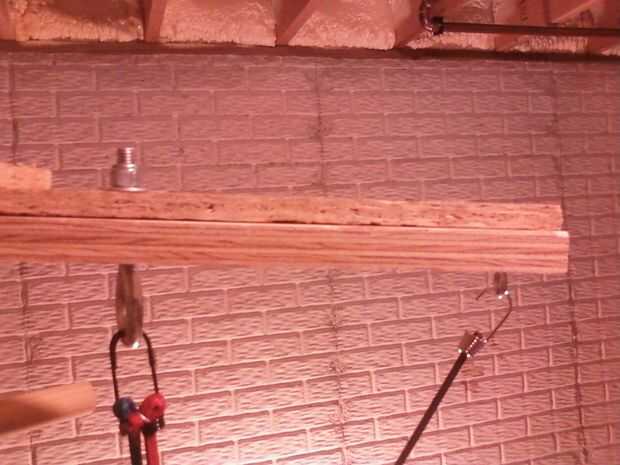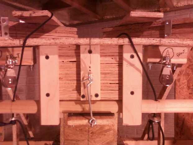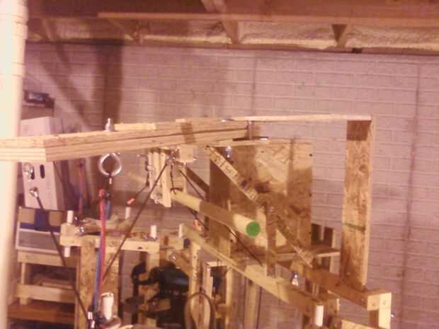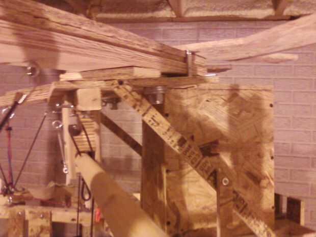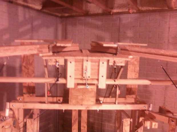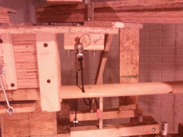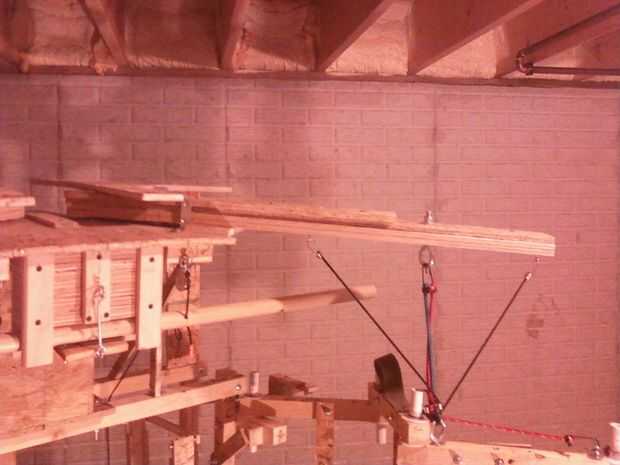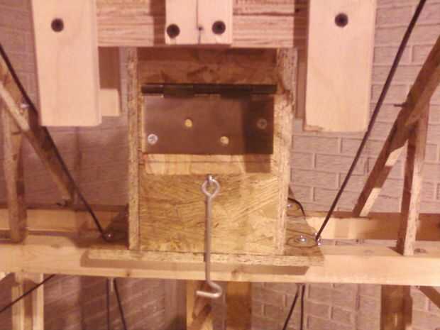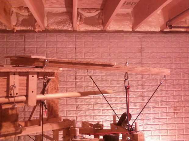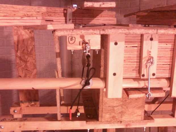 Hay un sistema de liberación (utilizando un 3" ojo y gancho de proceso junto con una bisagra de 4 pulgadas) que la barra de lat pulldown según sea necesario (que sí mismo era un 1 1/8" Álamo madera espiga que 48 pulgadas de largo).