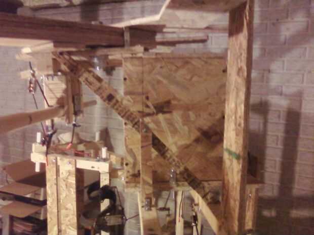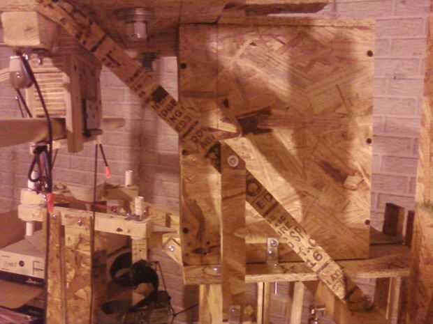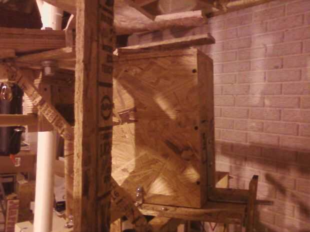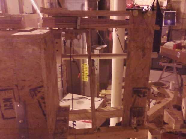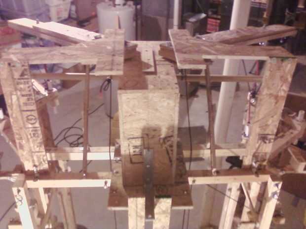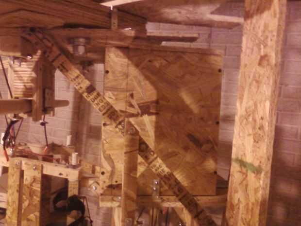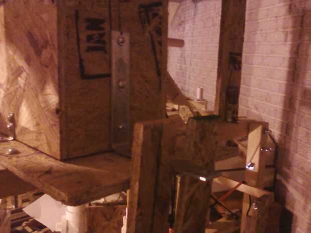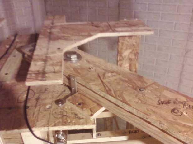 Una madera pulsado el arreglo, a ambos lados de la espalda, de las obras de la unidad junto con un tornillo grande (5/8" y 4 1/2 pulgadas de largo) con las arandelas correspondientes (5 de ellos) para mantener las hojas de soporte de mariposa en lugar sin cambiar su posición durante el funcionamiento del aparato. La sujeción del soporte fue una forma extraña de objeto (vea Diagrama A) que fue montado en el bastidor con L de metal en forma de paréntesis angulares (1 ½") y tornillos (1") de madera. Las palas de madera cada 33 pulgadas largo y realmente constan de 3 piezas de madera (para una altura total de 1 ½" pulgadas s altura unida con tornillos para madera de 1". Hubo una serie de conectores (2, ¼" ojos de tornillo, 1, 3/8" perno de ojo y 2 soportes de metal L de 2" pulgadas) adjunta a y por las hojas que se conectaron a varias cuerdas del amortiguador auxiliar utilizados para suspender a los brazos de mariposa en el aire el sistema de la pista.