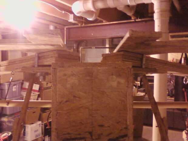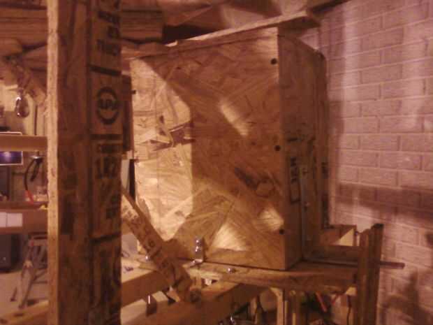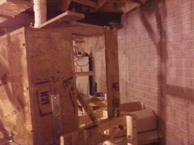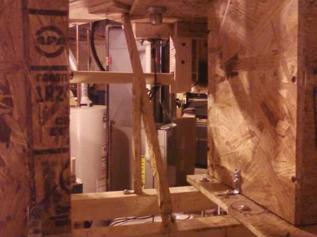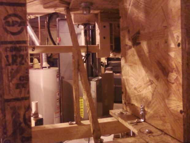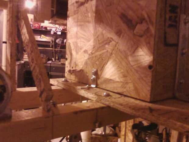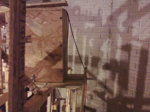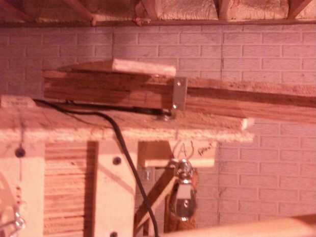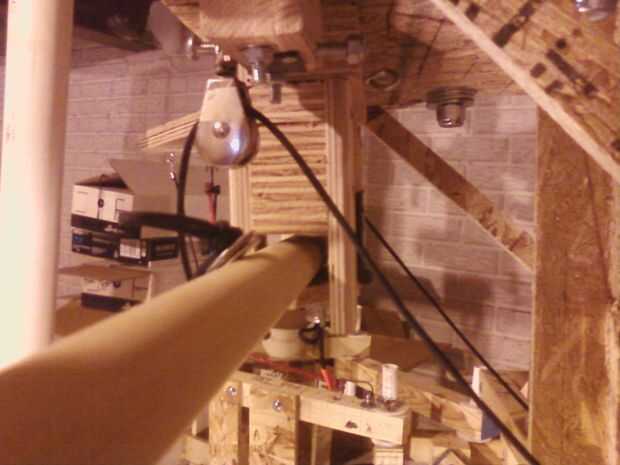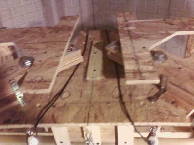 2 poleas (3/4 polea giratoria ojo) para el desplegable de ejercicio fueron montados en bloques de madera (2 "x 2" listones que fueron 2 1/4 pulgadas de largo) situado cerca de 7 1/2 pulgadas delante del cuadro desplegable que a su vez luego fueron montados en una plataforma de madera contrachapada (véase el diagrama "T" que no tiene encabezado al revés) con pernos ¼ que fueron de 2 pulgadas de largo.