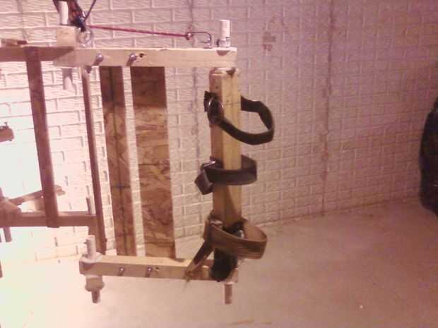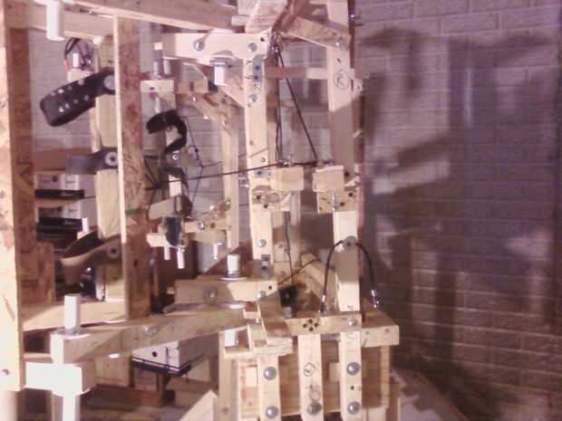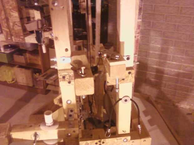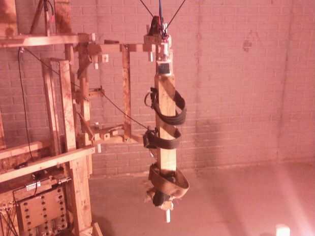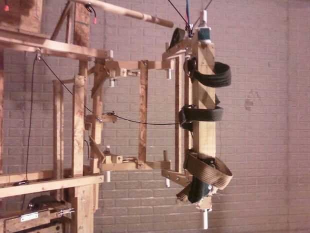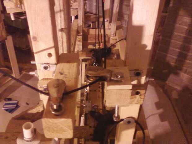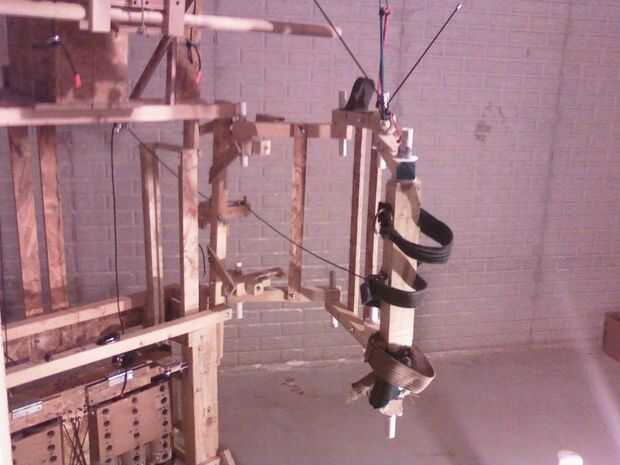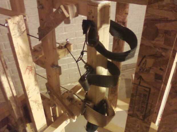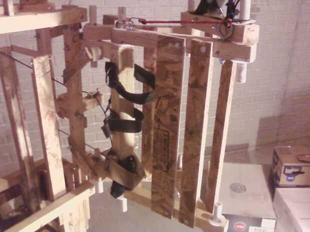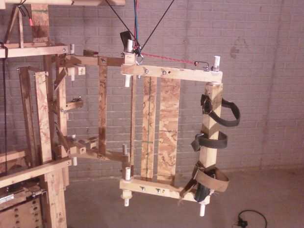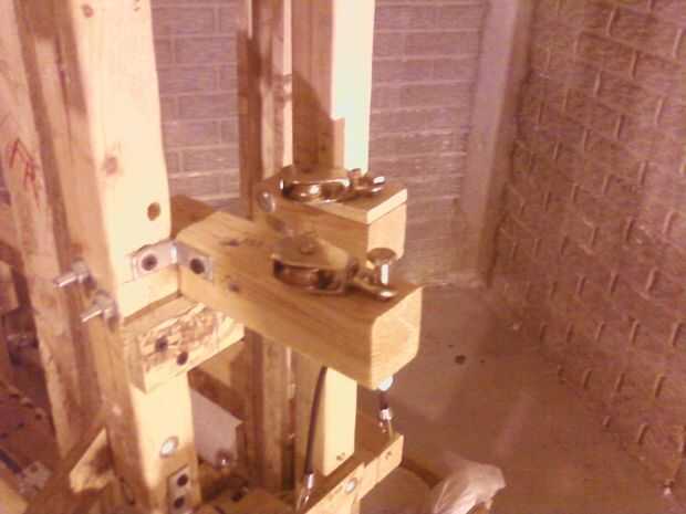 2 poleas a ambos lados de la deportista fueron atadas a bloques de madera (2 "x 2" listones que eran 3 1/2 pulgadas y 6 ¼ pulgadas de largo respectivamente) que fueron se une al chasis con pernos de máquina de ¼" cerca de 3 pulgadas en longitud. Las poleas también fueron Unidas a los bloques de madera con 1/4" tornillos de máquina 2 1/2 pulgadas de largo y se encuentra en los bordes exteriores de las piezas.