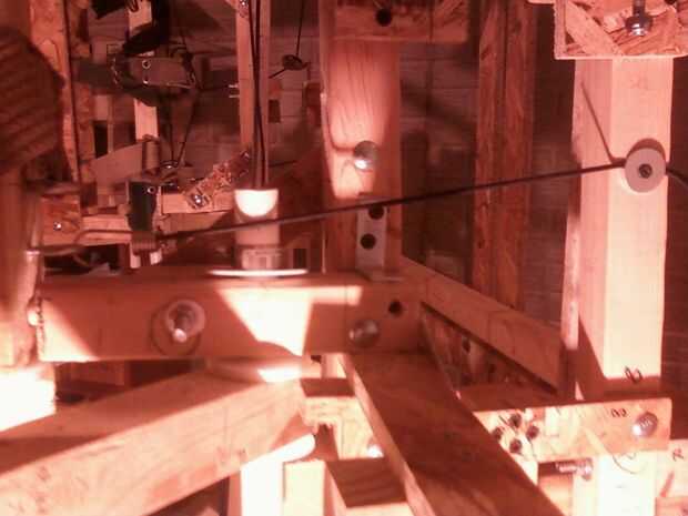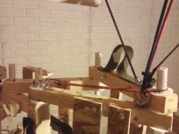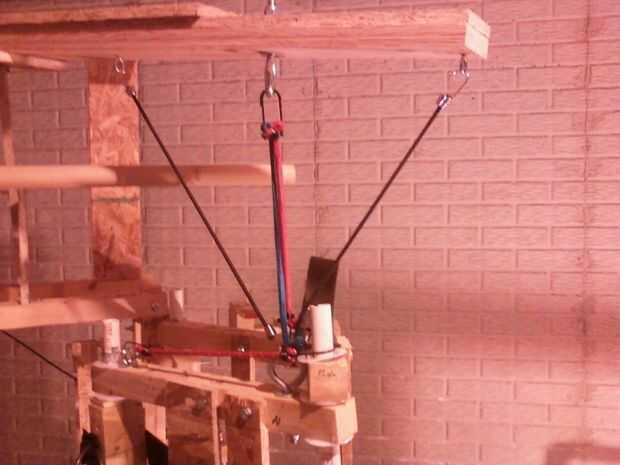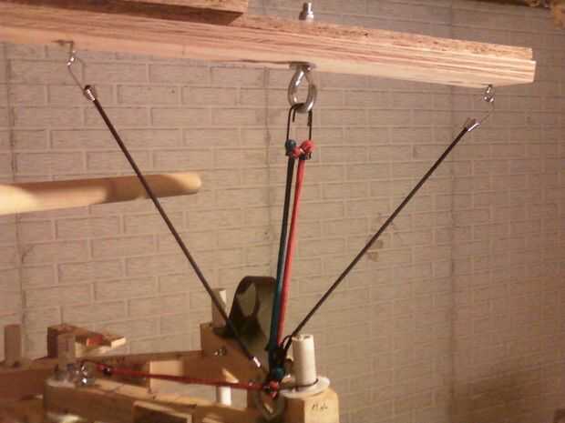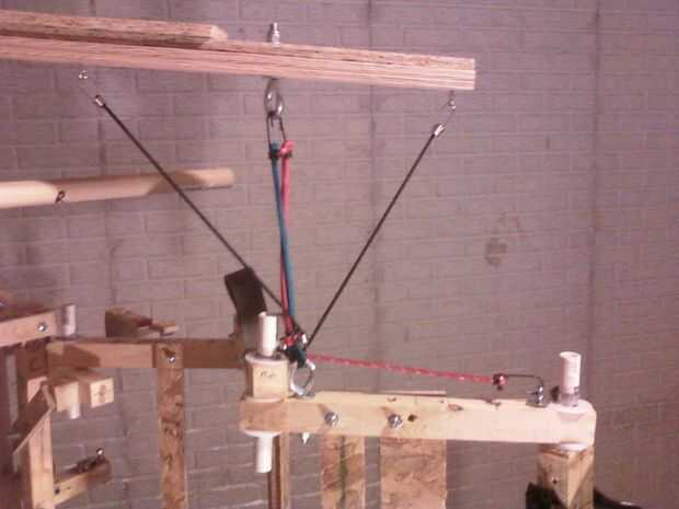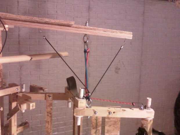 2 otras poleas fueron montadas justo debajo el desplegable de la barra cuadro de en el marco; se midieron unos 12 pulgadas desde el borde izquierdo y derecho. Una cuerda de párr de nylon (aproximadamente 112 pulgadas de largo) fue utilizada para conectar los brazos de mariposa a la caja de peso.