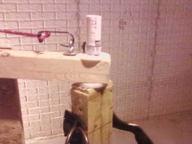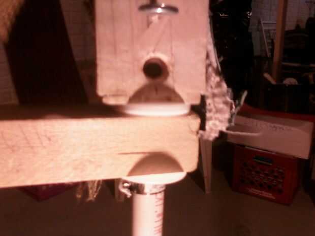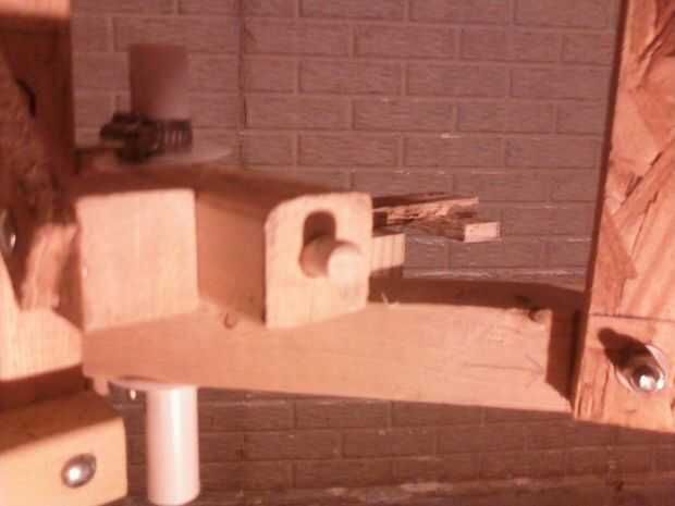 Hice una madera una parada de los mariposa los brazos Unidos a ambos lados del marco que era de 10 pulgadas de largos y 1 1/2 pulgadas de ancho. Tenía tres dientes madera en él con la parte delantera y la espalda siendo 2 ¼ ¼ de largo y 1 de ancho. El medio era 4 pulgadas de largos y 1 1/2 pulgadas de ancho (levantado de 1 1/2 pulgadas de alto) todo sostenido junto con tornillos para madera de 1".