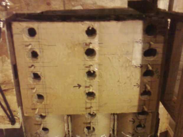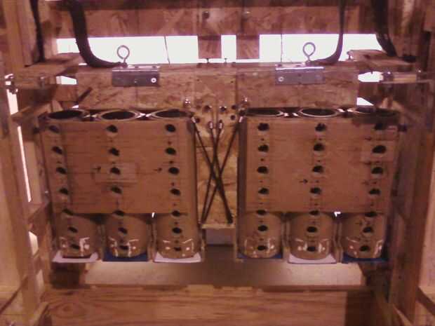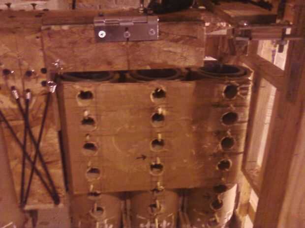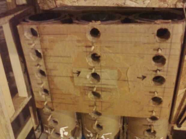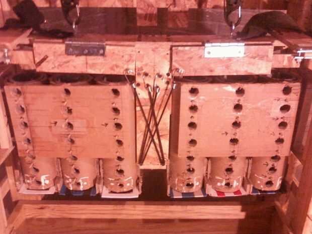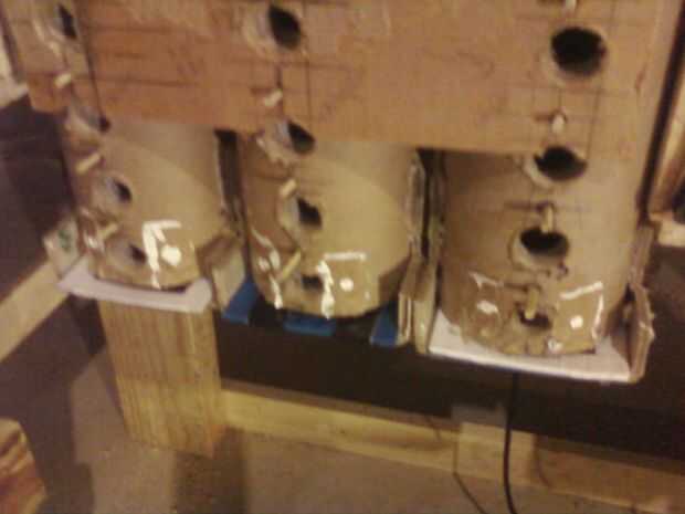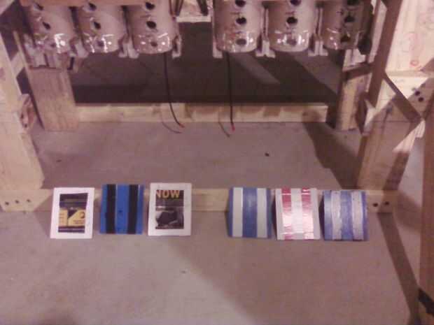 El peso de la caja es 6 tubos de cartón (cerca de 3 pulgadas de largo, 11 pulgadas de largo y espesor de 10/16) se unió junto con 4 pedazos de cartón plano (aproximadamente 10 pulgadas largo y 6 1/2 pulgadas ancho) montados en ellos (2 en la parte frontal) y 2 en la parte posterior con pegamento de madera. El transporte de peso tiene dimensiones de aproximadamente 14 1/2 pulgadas de ancho, aproximadamente 24 pulgadas de largos y unos 4 1/2 pulgadas de alto. Hay 7 puertos en cada tubo (los agujeros perforados en el cuadro de peso se hicieron con un ¾" serrucho a mano alzada y no en una prensa del taladro) por lo que un espectador puede decir como completo un peso por cada cada tubo fue durante un tiempo determinado. Los bordes de los fueron espaciados aproximadamente 3/4 de pulgada separada y visualmente se centraban en cada uno de los cilindros de la gota.