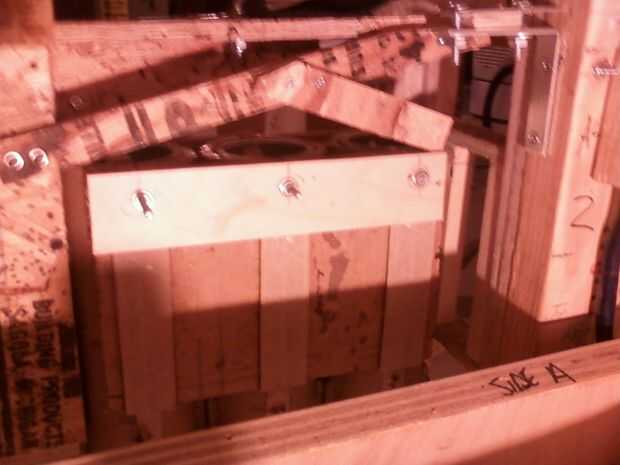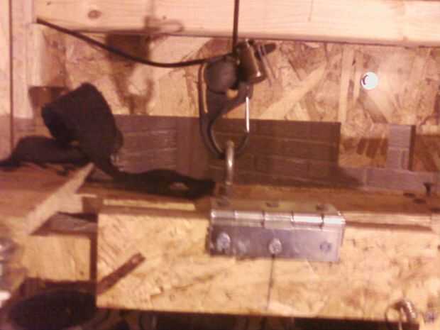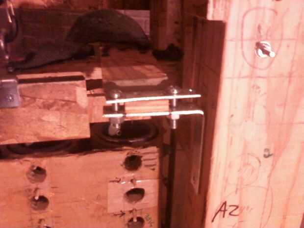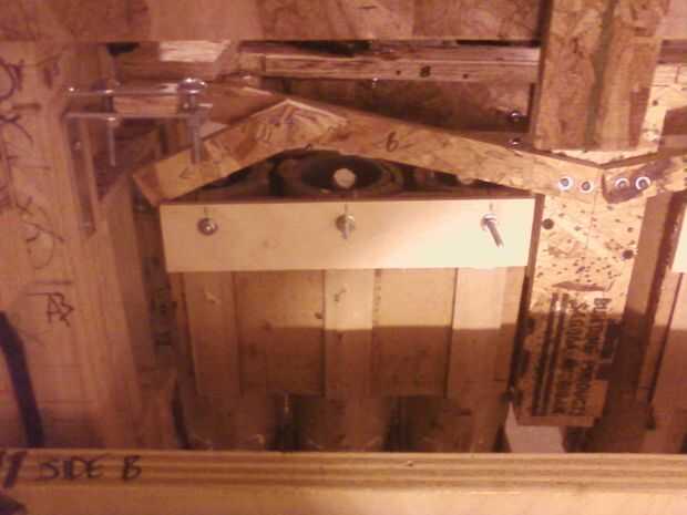 Los soportes que sujete el peso de la caja y permitan que se deslizan sobre 4 rieles de ejercitador fueron asegurados que por 1 1/2 pulgada largo #10 tornillos (los tubos son insertos que aquellos) 7 ¼ de largo por 6 1/2 pulgadas de ancho. Un pedazo de centro de madera (6 1/4 pulgadas de largo, 1 ¼ pulgadas de ancho y 3/4 de pulgada de altura) por añade estabilidad y mudanzas de muebles pequeños, 3 1/2 de pulgada de larga, 10/16 de una pulgada de ancho y una altura de 1/4 de pulgada, (a ambos lados de la lámpara) paseo en las ranuras del riel para ayudar a mantener en su lugar como él se mueve hacia arriba y hacia abajo.