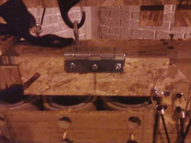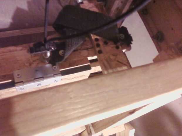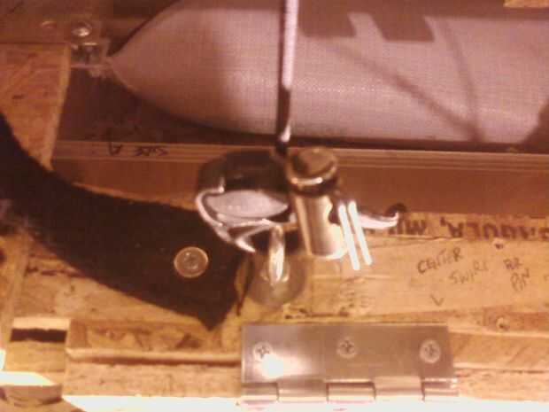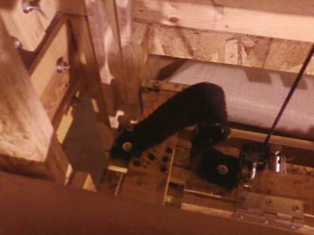 El cuadro de peso es 1 pie suspendido del suelo en su posición de reposo y unos 6 1/2 pulgadas desde el borde superior de la caja de dibujo. 4 soporte conjuntos utilizados 3 pulgadas recta y L en forma de piezas de metal (1 ½") con tornillos para madera (1 1/2 pulgada) y los pernos de la máquina (1/4" y ¾ pulgadas de largo) para apoyar piezas de madera que fueron 2 1/2 pulgadas de largos y 1 1/4 pulgadas de ancho...