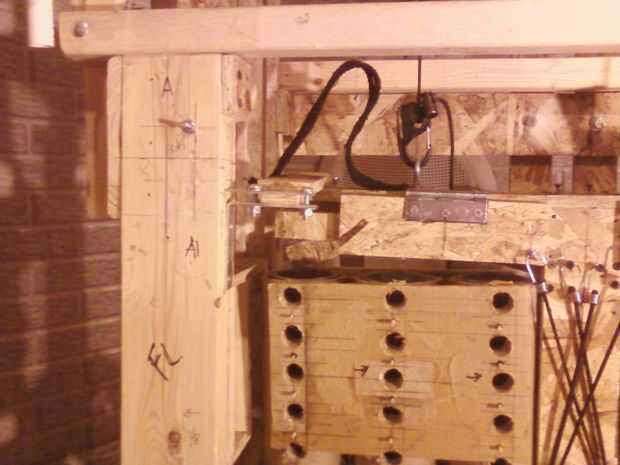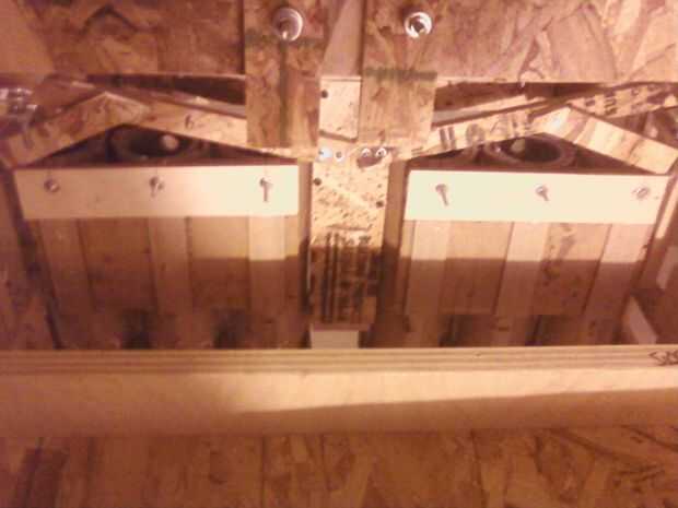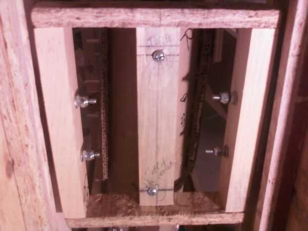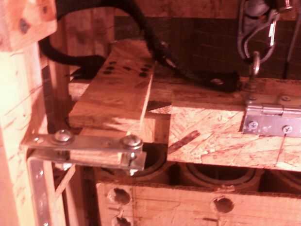 Un par de tiras de madera que se adjunta a la parte superior de la caja peso y controlado por las paradas verticales (en el marco) fueron 2 pulgadas de ancho y 8 pulgadas de largo (mantiene en posición por (7) 1" tornillos de madera a cada lado).