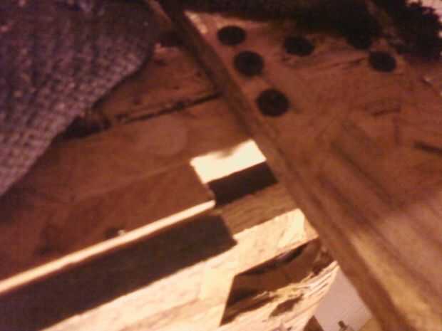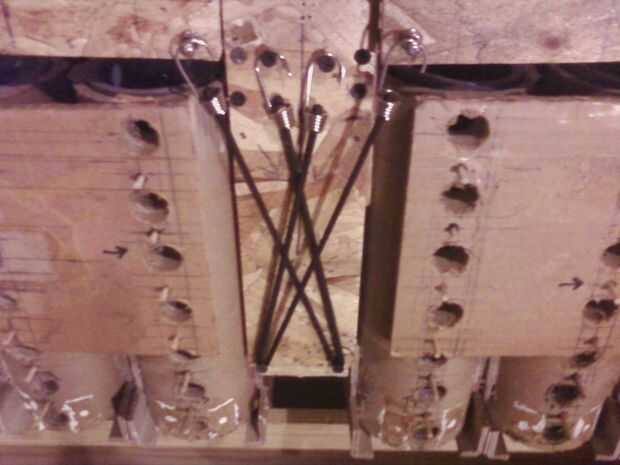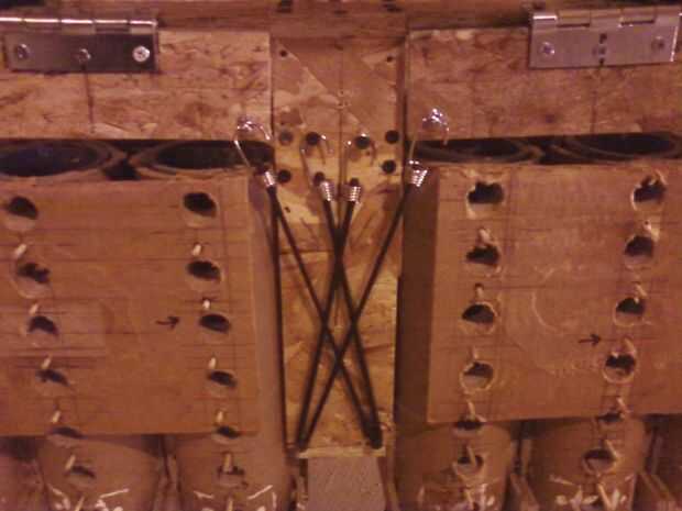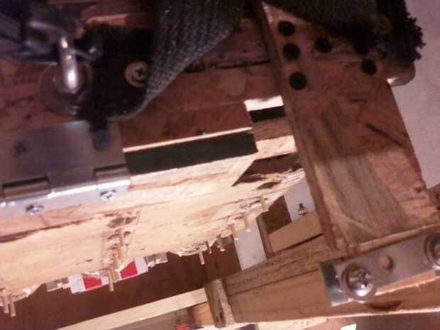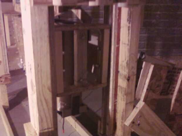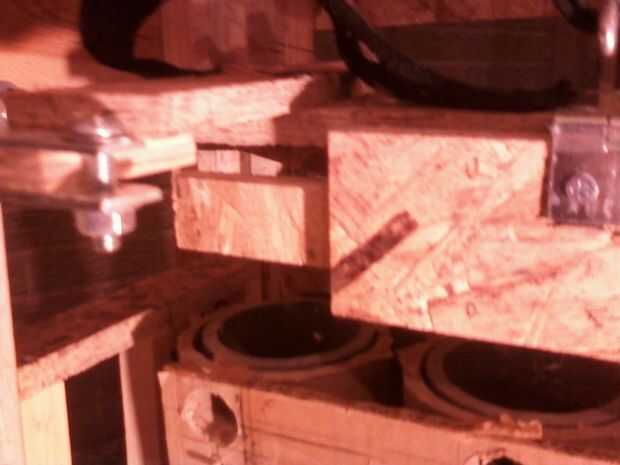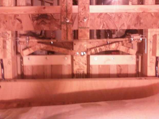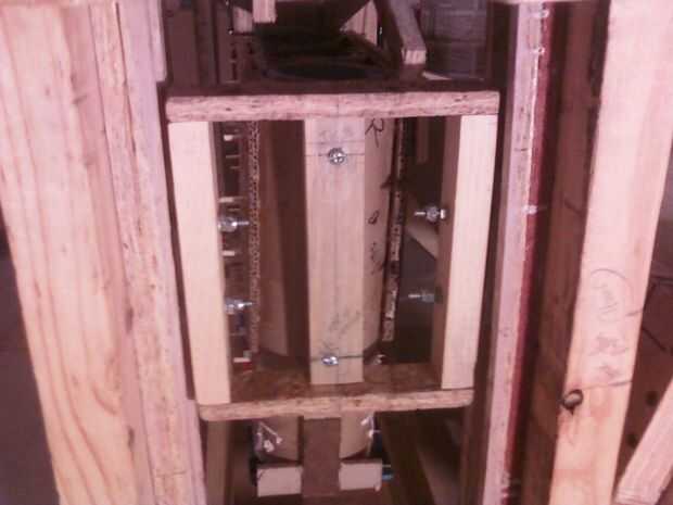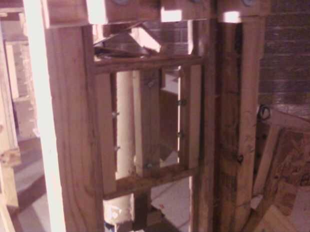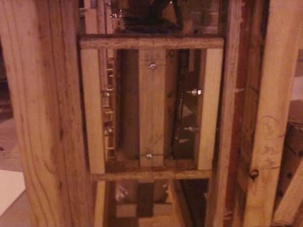 En la parte posterior de la caja peso son 2 travesaños de madera (13 pulgadas de largo y 1 pulgada de ancho) que añaden estabilidad adicional como viajaron hacia arriba y hacia abajo durante la operación. Madera de soporte de la primaria fueron cerca de 6 pulgadas de largo y 1 pulgada de ancho. 2 otras piezas de madera en la parte posterior de la unidad (10 pulgadas de largo y 2 pulgadas de ancho) también proporcionan apoyo aquí. La parte superior de la caja de peso en la espalda, fue conectada con su columna central por la forma de las barras de madera con tornillos para madera de 1".