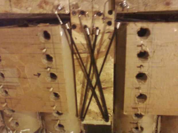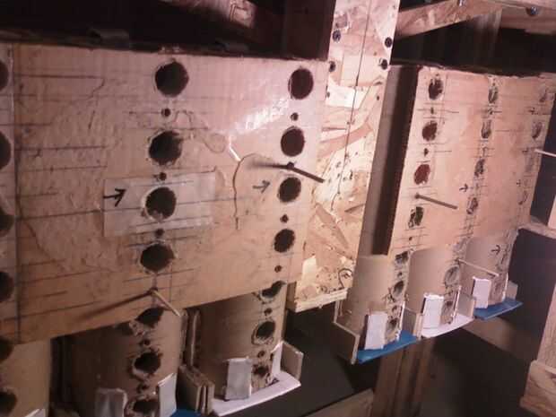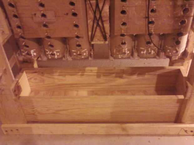 La parte superior de la caja Peso (donde las patillas de dos anclaje conectan a ¼" pernos de ojo que permite el cuadro de peso para subir y bajar uniformemente) es una sección de madera 2 1/2 pulgadas de ancho y 26 pulgadas de largo. Está conectado a su columna central de soporte de tornillos de madera de 1"(8). También es dentada en la parte delantera para permitir la extensión de la aleta pivotar hacia adelante y hacia atrás con facilidad: se trata de 2 9/16 pulgadas de centro y por 1/2 de pulgada en ambos lados.